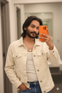 Use 100% face and body above uploaded photo and Upload my picture making taking a mirror selfie with an orange colour iphone 17 pro max phone. He is wearing a cream/off-white denim jacket over a white ribbed tank top. A silver chain with a white pendant is visible. The lighting is soft and warm. Close-up, high-detail portrait. Don’t change face.100% parsent sahi ho.