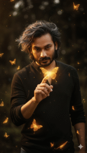 8K ultra-photorealistic, cinematic editorial portrait, 9:16 close-up half-body shot of a 32-year-old man in a dark natural background. He has voluminous windswept hair highlighted with metallic gray, glowing softly under the light. His face is charismatic and illuminated by a golden aura. He gently touches a luminous golden butterfly with one finger while many other glowing golden and orange butterflies of various sizes float and fly around him, creating a dreamy, magical atmosphere.