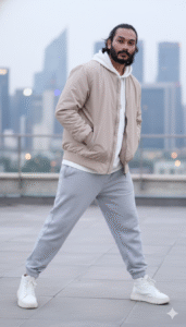 “A full-body photograph of me standing outside on a rooftop patio against the backdrop of a blurry metropolitan cityscape. I maintain a confident stance by keeping my legs apart and standing slightly sideways in the frame with my body twisted at a small angle. I have both hands idly tucked into my bomber jacket’s side pockets. I am wearing a white sweatshirt with the hood hanging loosely over my back, layered over a light beige bomber jacket with a little sheen that is somewhat big. The front pocket of the hoodie is visible underneath. Additionally, I am dressed in loose-fitting, light grey jogger sweatpants with elastic ankle cuffs. I am wearing spotless white sneakers with hefty soles. I am gazing straight into the camera with my head turned forward and a composed, assured attitude. I appear taller and more dominant in the picture since the camera takes me from a low angle. A 50mm portrait lens improves perspective and produces a natural appearance with a narrow depth of field that gently blurs the backdrop. A serene, urban, streetwear environment is evoked by the soft, diffused lighting. Upload an image with the same face.