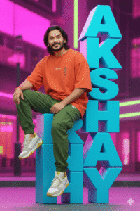 Create ultra-realistic digital art of a person in dynamic full-body pose. The subject wears casual relaxed outfits in bold colors (shirt, pants, shoes) appearing stylish and modern. Add a single text “AKSHAY” displayed vertically, rendered as large 3D block glossy letters in a bold contrasting color. The text should appear only once, without repetition, and be big enough to look like a real object. Make the model interact with the text, for example sitting on, Same face….