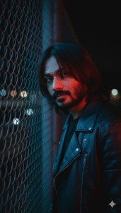 Create a moody, cinematic night portrait of a young man standing beside a chain-link fence. , His expression is calm, slightly enigmatic, as he turns his head subtly toward the camera. A cool, bluish overhead light casts a stark glow on his hair and the top of his head, while a contrasting red-tinted light washes softly across his eyes and upper cheeks, creating a dramatic dual-tone lighting effect. he wears a black leather jacket that reflects hints of the surrounding light. The background fades into deep shadows with only faint, blurred hints of distant lights. The overall mood is atmospheric and introspective, blending neon-noir aesthetics with a quiet sense of isolation and urban nighttime energy. use my uploaded photo as face reference
