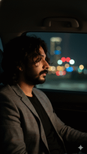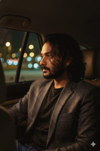 Create a cinematic portrait of a man sitting in the back seat of a car at night, her curly hair partially obscuring his face, wearing gold hoop earrings, a checkered blazer. The city lights blur through the window, creating a warm filmic glow with soft focus and moody highlights. use my uploaded photo as face reference