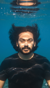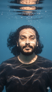 Create a close-up underwater portrait of a young man submerged just below the surface, with his face filling most of the frame. Soft, wavy patterns of refracted sunlight ripple across his skin, creating intricate lines of golden light that shift with the water’s movement. Tiny air bubbles drift upward around his, adding texture and depth to the scene. his hair floats gently behind his in dark, weightless strands. his expression is calm and serene, with his eyes softly open and his lips relaxed. The surrounding water is a clear, cool blue that gradually deepens in tone toward the edges of the frame. The overall mood is ethereal, tranquil, and dreamlike. us my uploaded photo for reference for face 100%.