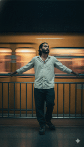 Create a cinematic, atmospheric scene set in an underground metro station. A young man stands in front of a rapidly passing yellow train, its motion captured as a soft blur of warm tones and streaked windows. he leans back slightly against a metal railing with his arms extended on both sides, creating an open, balanced posture. he wears an oversized, light-colored button-up shirt with the top buttons undone, paired with dark trousers. His hair is slightly tousled, and he gazes upward and to his right with a thoughtful, almost searching expression. The lighting is moody and diffused, blending the cool shadows of the station with the golden reflections bouncing off the train. The overall mood is introspective, cinematic, and quietly dramatic, emphasizing motion, solitude, and the fleeting nature of urban moments.
