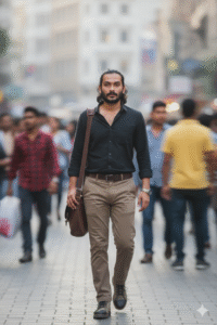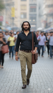 Create a dynamic street-scene portrait of a young man walking through a crowded urban environment. Her hair moves slightly with her motion, and his expression is calm, thoughtful, and focused straight ahead. he wears a dark, buttoned shirt tucked into high-waisted, soft earth-toned trousers, with a brown shoulder bag hanging at his side. The background is filled with fast-moving pedestrians rendered in a dramatic motion blur, creating a strong contrast between his stillness and the surrounding rush. The depth of field isolates his sharply while the crowd dissolves into streaks of color and movement. The lighting is soft and diffused, giving the entire scene a cinematic, contemplative feel.
