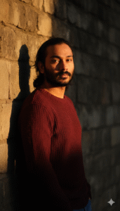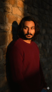 Create a cinematic portrait of a young man in warm afternoon light, soft focus on his face, golden highlights catching his hair, wearing a dark red textured sweater, leaning against a wall with deep shadow contrast and moody atmosphere. us my uploaded photo for reference for face 100%
