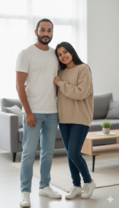 Create a casual Valentine’s Day couple photo of a young adult man and young adult woman standing close in a bright living room, the man standing relaxed with one hand in his pocket, the woman leaning slightly into his shoulder, both smiling softly, the man wearing a plain white t-shirt with straight-fit jeans and sneakers, the woman wearing an oversized beige sweatshirt with fitted jeans, minimal makeup, natural skin texture, camera shot at eye level, soft window daylight, tidy modern interior, authentic Instagram lifestyle aesthetic. Use aspect ratio 4:5.