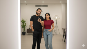 Create a stylish Valentine’s Day mirror-style couple photo of a young adult man and young adult woman standing side by side in a modern apartment, the man holding the phone at chest level, the woman standing slightly closer to him with one hand in her pocket, the man wearing a fitted black t-shirt and trousers, the woman wearing a red fitted top with high-waisted jeans, clean makeup, sleek hair, camera straight-on mirror angle, soft indoor lighting, minimal interior, polished Instagram mirror photo aesthetic. Use aspect ratio 4:5.
