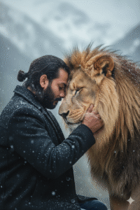 Ultra-realistic cinematic 8K scene: a man (use uploaded photo for face) and a majestic lion gently touch foreheads in falling snow, eyes closed, sharing a moment of trust and spiritual connection. The man wears a dark coat, and the lion’s mane is thick and soft. Soft, diffuse winter light highlights skin, fur, and fabric textures. Misty mountains blur in the background, evoking calm, courage, and harmony between man and nature. Use the same face upload image