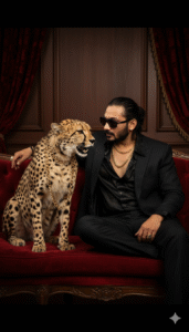 His air of unadulterated power is reflected by the cheetah, which sits near him with an open jaw and a ferocious face. The background is understated yet opulent, including dark wood or velvet textures in a darkly lit room that highlights luxury and peril. usemy uploaded photo as reference photo