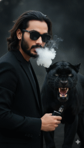 Make a portrait, prompt. A young man does not alter my face’s features; it remains the same as the reference photo. A dramatic appearance with long hair swept back down, posture at 60 degrees. He is wearing black clothing and sunglasses. He is holding a vape pen, and a lot of smoke is coming out of his lips. His back is blurry and dark. Behind him, a single black panther was displaying an intimidating face. Use the same face upload image.