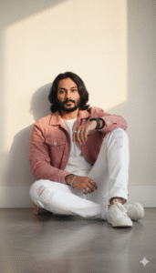 A trendy young man resting comfortably on an interior floor, leaning back against a simple off-white wall with sunshine creating a gentle shadow, is depicted in this ultra-realistic full-body image. Outfit: frayed white jeans, white sneakers, and a white round-neck t-shirt layered over a faded pink jeans puffer jacket. Silver rings, a bracelet, and an Apple Watch are examples of accessories. His hands, face, and black, wavy hair are all in a comfortable stance, with one knee bent upward. Use the same face in the uploaded picture.