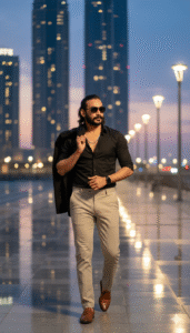 Ultra-realistic cinematic full-body fashion portrait of a stylish young man, using my exact face and hairstyle. He wears a fitted black button-down shirt with top buttons open, paired with tailored light beige trousers and brown loafers. A matching blazer is draped over his shoulder. Accessories include a sleek silver chain, a black wristwatch, and sunglasses. He walks confidently on a modern city waterfront at dusk, with skyscrapers glowing in the background, soft reflections on the floor.Use the same face upload image.