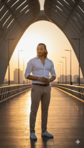 Ultra realistic 8K full-body portrait of the same man (exact face & hairstyle), standing confidently on Meydan Bridge, Dubai, during golden hour. Wearing a white fitted shirt, beige trousers, and white sneakers with sunglasses. Soft sunset glow, warm tones, cinematic lighting, detailed reflections — ultimately enhanced hyper-realistic. Use the same face upload image and hairstyle, which was long like model