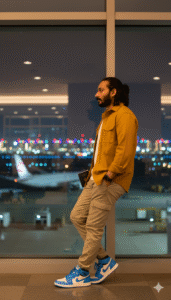 Cinematic low-angle, full-body side-profile vertical portrait of a young Indian travel influencer (use the reference image) casually leaning against the glass window of an airport lounge. He is wearing a dark yellow overshirt jacket layered over a white T-shirt, with the sleeves rolled up to his elbows, paired with relaxed-fit cargo pants and Nike Jordan University Blue high-top sneakers. Use same face upload image and hairstyle was medium long size like the model