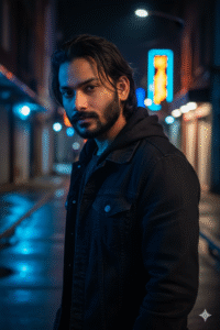 Moody 4K portrait of a stylish boy with dramatic lighting, deep shadows, strong contrast, cinematic blue/orange tones, confident stare, premium sharpness.”