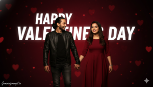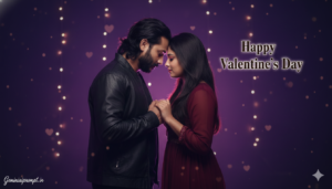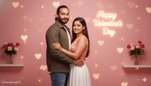 Use the uploaded boy photo and uploaded girl photo as the ONLY facial references. Do NOT change facial structure, eyes, nose, lips, jawline, skin tone, beard, hairline, age, or expression. No beautification, no smoothing, no AI face regeneration. Preserve real skin texture, pores, natural asymmetry, and real human imperfections. Faces must be 100% identical, crystal clear, and instantly recognizable. VALENTINE’S DAY COUPLE – ULTRA-REALISTIC CINEMATIC PROMPT Create an ultra-realistic Valentine’s Day couple portrait with a natural, emotional, cinematic feel. The image must look like a real professional DSLR photograph, not AI-styled. SCENE & STORY An indoor romantic Valentine’s Day setup where a couple shares a quiet, heartfelt moment together. The atmosphere feels warm, intimate, and emotionally connected — simple but powerful. POSE & BODY LANGUAGE Boy standing slightly turned toward the girl Girl standing close beside him, gently holding his arm Bodies relaxed and natural, not stiff Comfortable personal space, natural closeness No exaggerated or dramatic posing Each pose must feel real, candid, and human. EXPRESSIONS Boy: soft confident smile, calm romantic eyes Girl: gentle smile, warm emotional eyes No overacting No fake happiness BACKGROUND & DECOR Soft pink and warm peach gradient background Subtle fairy lights creating smooth heart-shaped bokeh A few roses placed naturally in the scene Cinematic glowing text on the wall: “Happy Valentine’s Day” Elegant, bold, blended naturally with the lighting (not flat text) OUTFITS (MODERN & REALISTIC) Boy: modern casual jacket or shirt, jeans, sneakers Girl: elegant modern outfit (top or dress with jeans/skirt) Real fabric texture, natural folds Colors soft and romantic LIGHTING Warm cinematic indoor lighting Balanced highlights on faces Soft shadows for depth No face glow No blur No harsh contrast CAMERA & COMPOSITION Professional DSLR photography look Eye-level angle Medium close-up framing Shallow depth of field Faces in sharp focus Background softly blurred QUALITY & STYLE Ultra-realistic High-definition facial clarity Natural skin texture visible 4K / Ultra-HD quality Looks like a real Valentine photoshoot NEGATIVE PROMPT anime, cartoon, illustration, CGI, plastic skin, face mismatch, beautified face, smooth skin, blur, extra fingers, extra people, distorted anatomy, watermark, logo TEXT / SIGNATURE Add “Geminiaiprompt.in” at the bottom-left corner, handwritten signature-style typography, thin cursive strokes, small size, subtle premium elegance, white or soft off-white color. ASPECT RATIO 3:4 vertical